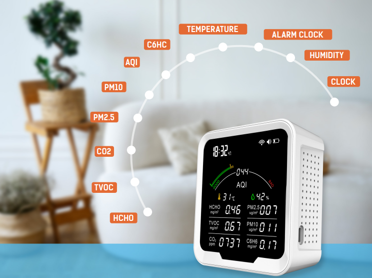 Track 6 air quality factors. Accurately detect the current CO2 concentration, temperature, humidity and PM2.5 in the air. Wifi function available, connect device with Tuya App and view the data in realtime. It can connect with Eco Pair ERV without wire, and control them according to the detected data to ensure air quality at any time. The operation functions can be designed according to the preference of users.