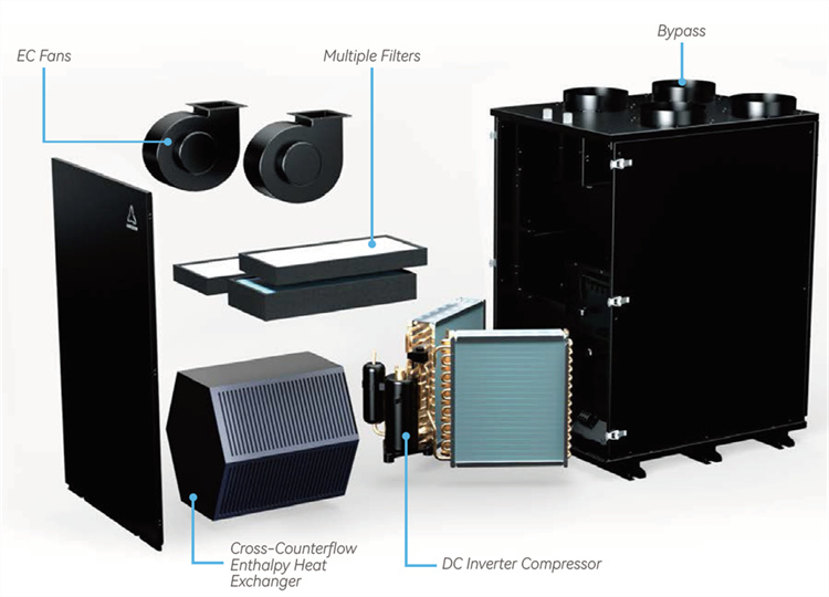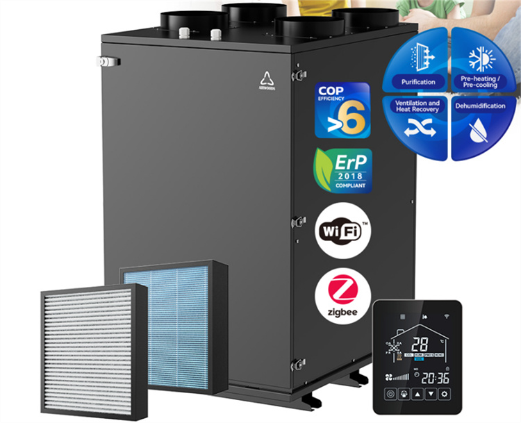 Airwoods Energy Recovery Ventilator with Heat Pump combines heat pump and fresh air ventilation technology, enabling not only heating and hot water but also temperature-regulated airflow, dehumidification, and air purification. The system preconditions fresh air, helping to reduce overall heating and AC costs, and can act as an independent air conditioner under appropriate seasonal conditions. Equipped with EC fans and a DC inverter compressor, the system is optimized to minimize energy consumption, offering wide ambient working conditions from -15˚C to 50˚C. It also includes indoor air quality monitoring for CO₂, humidity, TVOCs, and PM2.5, enhancing comfort and air quality.
