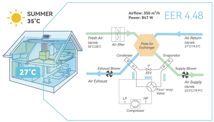 - Summer: Fresh air is supplied at 23.5˚C DB/19.9˚C WB from initial DB/WB of 35˚C/28˚C.