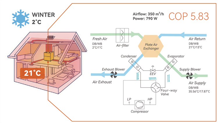 - Winter: Air supply reaches 35.56˚C DB/17.87˚C WB from fresh air at 2˚C DB/1˚C WB.